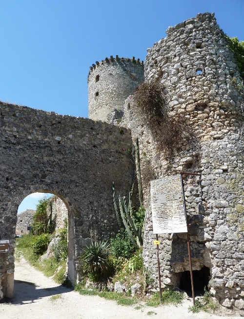 La fortezza è composta da 4 torri, di cui la più massiccia è detta torre “mastra”. L'interno è ormai completamente diruto, però ancora sono visibili la suddivisione dei piani, le cucine, le carceri e l'antica cisterna. Il borgo è circondato da mura intervallate da 14 torri. Tre porte consentono l'accesso al borgo: Porta Oliva, Porta di Mezzo o Mezzogiorno e Porta Castello o S. Andrea. All'interno è visitabile l'antica chiesa di S. Tommaso Apostolo (XIV sec.), mentre appena fuori delle mura, da poco restaurata, è ubicata la chiesa di S. Maria di Loreto (XVI sec.).